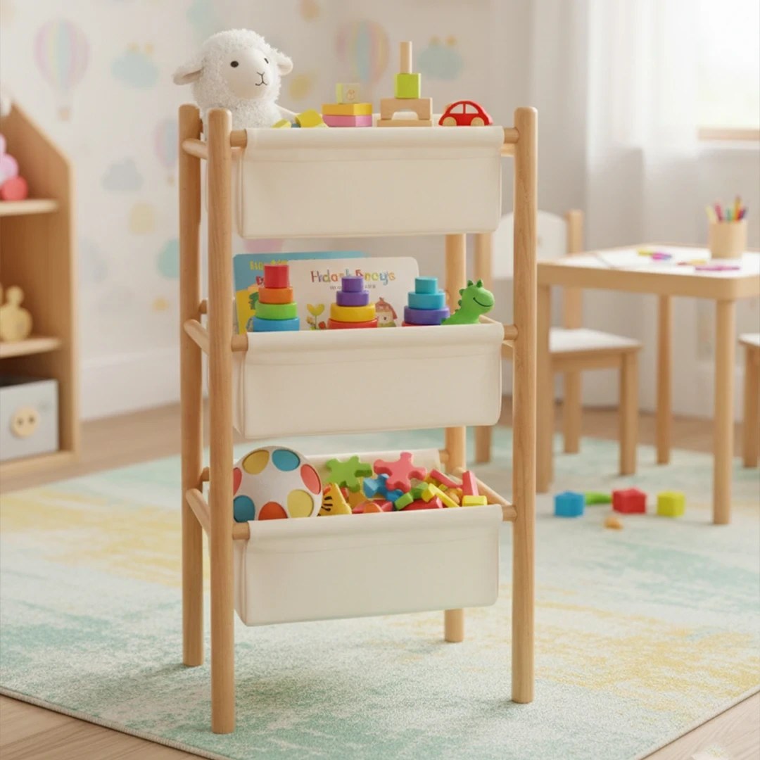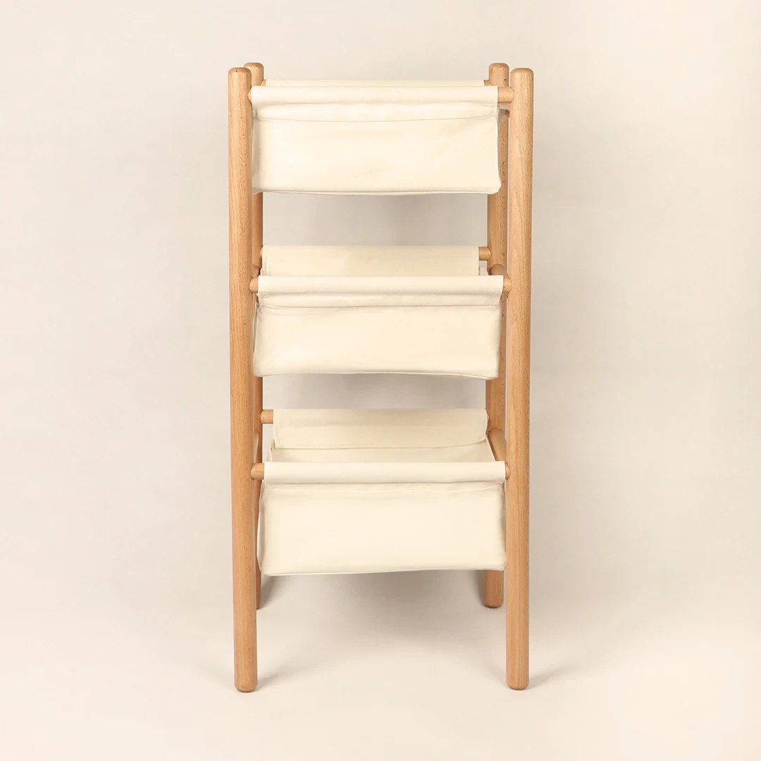 ساختار اصلی آن از چوب راش وارداتی مرغوب تشکیل شده که استحکام، طول عمر و زیبایی طبیعی چوب را تضمین میکند. سبدهای پارچهای سفید و مقاوم، جداسازی و نظمدهی وسایل را آسان میسازند و قابل شستوشو هستند.