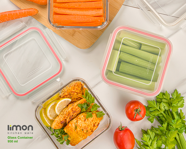 ظرف شیشه ای 950 میلی لیتر لیمون ظرفی درب دار از جنس شیشه میباشد.این ظروف در خانه و حتی محل کار کاربرد زیادی دارد.ظروف شیشه ای درب دار نگهدارنده غذا جز مهم ترین لوازم آشپزخانه می باشند. با وجود این ظروف می توان غذا ها را برای مدت زمان طولانی تری نگه داشت بدون این که نگران تغییر بو و مزه آن ها بود.درب این ظروف طوری ساخته شده که محکم روی ظرف قرار گرفته و باعث میشود غذا از درون آن نریزد.این محصول بسیار مقاوم و محکم است. شما میتوانید به مدت طولانی غذا یا انواع سبزیجات و میوه را نیز در آن قرار بدهید. این محصول دارای نوار سیلیکونی برای جلوگیری از تبادل هوا می باشد که موجب محافظت مواد غذایی در برابر باکتری های هوازی می شود و همچنین از جذب و انتشار بوی نامطبوع جلوگیری می کند. این ظرف قابلیت استفاده در یخچال، فریزر، فر، ماکروویو و ماشین ظرفشویی را دارد. برای استفاده داخل فر و ماکروویو درب ظرف حتما برداشته شود.